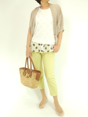 ナチュラルな休日スタイルにドット柄とイエローのパンツで少しポップな味付けを!フェミニン度70%、アクティブ度30%。