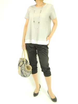 後姿が個性的な異素材カットソーは、黒のパンツとのシンプルコーデで!スタイリッシュ度90%、アクティブ度10%。