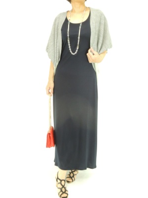 シンプルなマキシワンピはボレロタイプのカーデとロングネックレスを合わせればバランスよくまとまります!エレガンス度60%、スタイリッシュ度40%。