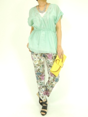ビジュー付きブラウスやボリュームネックレスでデコルテを華やかに飾った、柄パンツのスタイリッシュなコーディネート!スタイリッシュ度90%、エレガンス度10%。
