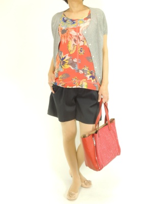 鮮やかな花柄ブラウスはショートパンツでヘルシーに着こなすのもおススメです!フェミニン度70%、アクティブ度30%。