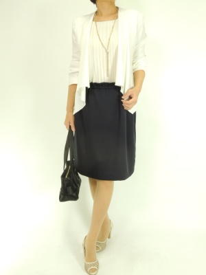 ドレープの効いた細身のジャケットを羽織ると、上品ワンピもカッコよく決まります!エレガンス度70%、スタイリッシュ度30%。