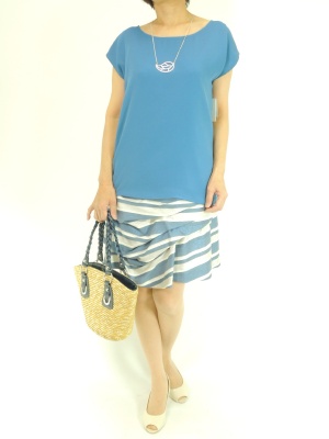ブルー系でまとめた爽やかなコーデ。デザインのアイテムはサラリとシンプルに着こなしたい!エレガンス度60%、フェミニン度40%。