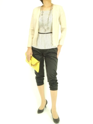 ぺプラムブラウスにはティーパードパンツを。流行のアイテムを使ったシックなコーディネートです!スタイリッシュ度90%、エレガンス度10%。