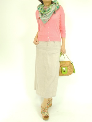ロングスカートはコンパクトなトップスとヒールの高いウエッジサンダルでバランスよく見せて!アクティブ度90%、フェミニン度10%。