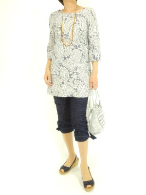 ペイズリー柄の上品チュニックはリボンパンツでフェミニンに。ランチにもピッタリのスタイルです!フェミニン度70%、エレガンス度30%。