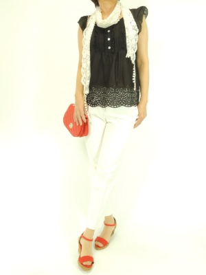 甘口モノトーンコーデには赤の小物でスパイスを効かせて!エレガンス度60%、フェミニン度40%。