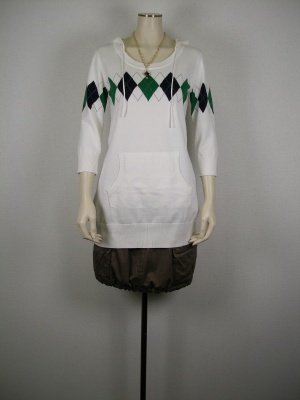 丈長のニットをカーゴスカートと合わせてワンピース風に・・。スポーティ中にフェミニンさが漂うコーディネート!アクティブ度80%、フェミニン度20%。