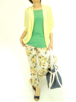 カラフルなコーディネートは気分も上がります。柄パンツの色をトップスでリンクさせているので、多色使いでもスッキリまとまります!アクティブ度60%、スタイリッシュ度40%。