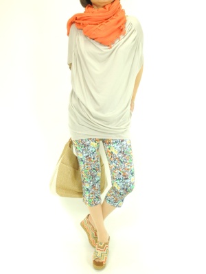 柄パンツを使ったカジュアルコーデ。パンツの柄の一色をストールで繰り返すとまとまりがでます!アクティブ度90%、スタイリッシュ度10%。