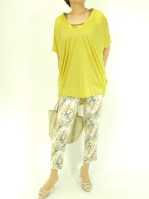 流行の柄パンツは柄の色にリンクさせた無地トップスで大人っぽくまとめて!スタイリッシュ度80%、アクティブ度20%。