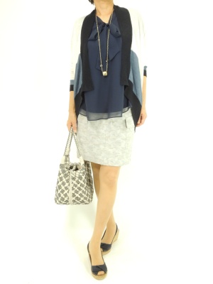 上品なシフォンブラウスに、ゆったりしたカーデを羽織るとこなれた感じに!フェミニン度60%、スタイリッシュ度40%。