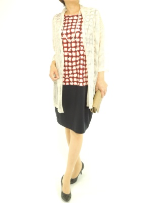 ローウエスト切り替えのワンピースにはロングカーデを羽織るとまとまります!フェミニン度60%、エレガンス度40%。