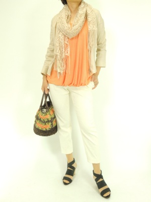 ジャケットとアンクル丈パンツは辛口派の定番ですね。キレイ色をインナーに使うと夏らしくてオシャレです!スタイリッシュ度90%、フェミニン度10%。