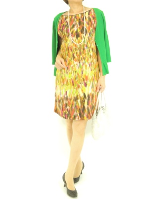 鮮やかなプリントのワンピースには、その色に負けない綺麗なグリーンのカーデを羽織って!エレガンス度80%、スタイリッシュ度20%。