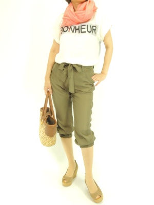夏のゆるコーデはストールでポイントを作り、裾をたくし上げるとスタイリッシュに決まります!スタイリッシュ度60%、アクティブ度40%。