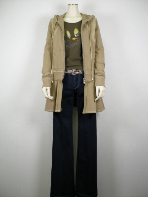 渋い色のコーディネートには、Tシャツのキラキラと、パーカのヒラヒラがちょうど良いアクセントに。少し個性を主張できる公園スタイルです!アクティブ度100%。