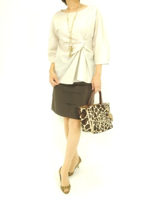 夏の終わりは秋を感じる色使いで。デザインの効いたブラウスはシンプルコーデが一番です!フェミニン度70%、エレガンス度30%。