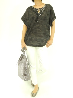 個性的な迷彩柄のブラウスは白パンツで爽やかに着こなして!アクティブ度90%、スタイリッシュ度10%。