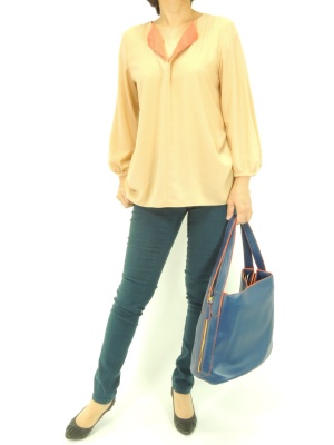 ソフトなゆるブラウスにはスキニーパンツを合わせてカッコよく決めて!スタイリッシュ度80%、アクティブ度20%。