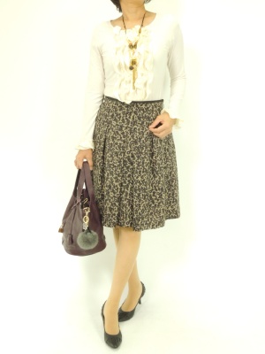 アニマル柄のスカートもフリルたっぷりのカットソーと合わせればこんなにフェミニンに!フェミニン度60%、エレガンス度40%。
