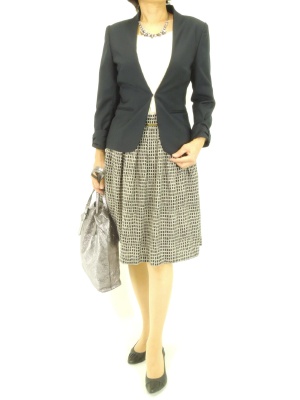 ジャケットを羽織ったきちんとコーデは柔らか素材のスカートで女らしい印象に!スタイリッシュ度60%、エレガンス度40%。