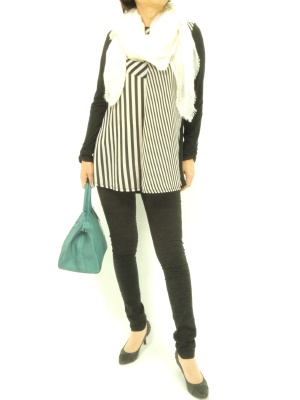ストライプのカットソーとスキニーパンツで作る辛口カジュアル。ふんわりストールで少し抜け感を!スタイリッシュ度80%、アクティブ度20%。