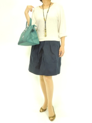 トップスはスエットですが甘口シルエットなのでカジュアルすぎません。だまし絵バッグで遊び心をプラスして!フェミニン度80%、エレガンス度20%。