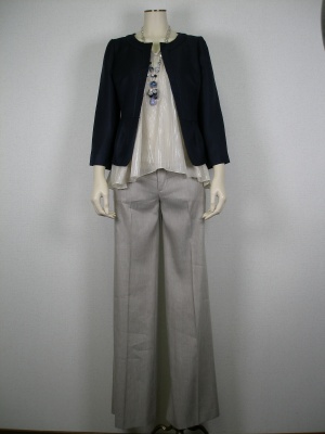 ネイビーとベージュはオフィスでも安心な組み合わせ。でも硬くなりすぎないよう、インナーは軽いシフォンで!スタイリッシュ度80%、エレガンス度20%。