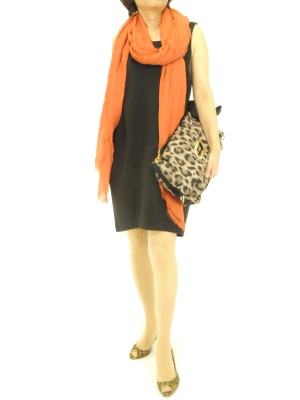 ノースリーブのコクーンワンピはストールを垂らして縦ラインを強調。アクセントにビッグクラッチを!スタイリッシュ度90%、エレガンス度10%。