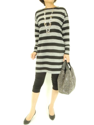 ボーダーワンピとレギパンのアクティブなコーディネート。でも後姿はリボンとシフォンでとってもフェミニンです!フェミニン度60%、アクティブ度40%。