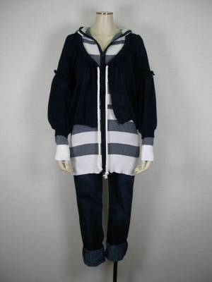 スリムなデニム。裾をロールアップしてカジュアル度をアップ。お子様との休日ファッションにおすすめなコーディネートです!アクティブ度100%。