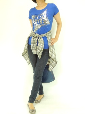 腰に巻いたシャツがアクセント。Tシャツとデニムのタイトなラインを出しつつも、ちょこっと隠すテクです!アクティブ度100%。