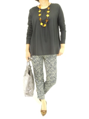ネイビーのコーディネートはこの秋大注目です。異素材カットソーや柄パンツなどの流行アイテムが上品にまとまる!フェミニン度60%、スタイリッシュ度40%。