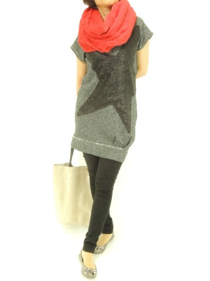 カジュアルなスエットもこの秋はお洒落に進化しています。赤のスヌードで先取り感をプラスして!アクティブ度70%、スタイリッシュ度30%。