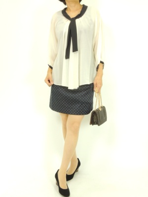 短めのスカートならブラウスはウエストにインせず、ふんわりさせてもOK。さりげなくカバーしつつ、スッキリ見えます!フェミニン度70%、エレガンス度30%。
