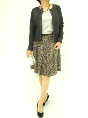 エレガントでキチンとしたジャケットスタイル。アニマル柄のスカートで程よくトレンド感をプラスして!エレガンス度80%、スタイリッシュ度20%。