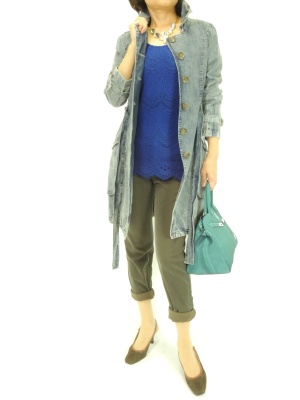 ハードなイメージのデニムのコートはレースのインナーで綺麗目に着こなしたい!スタイリッシュ度70%、アクティブ度30%。