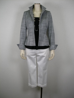 ツイードのジャケットを白の半端丈でカッコよくお洒落する。通勤ファッションに目上の人の印象が良く見えるコーディネート!スタイリッシュ度100%。