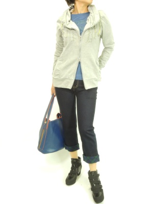 パーカとデニムのデイリーカジュアルをヒールスニーカーでお洒落に格上げ!アクティブ度90%、スタイリッシュ度10%。