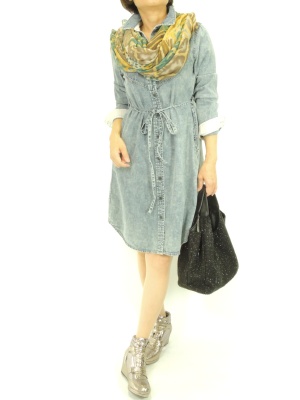 ガーリーなデニムワンピはストールとヒールスニーカーで大人カジュアルに!フェミニン度60%、アクティブ度40%。