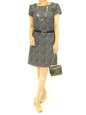 シンプルシルエットのワンピースは小物使いで差をつけたい。ベルトと大ぶりネックレスで引き締まった印象に!エレガンス度80%、スタイリッシュ度20%。