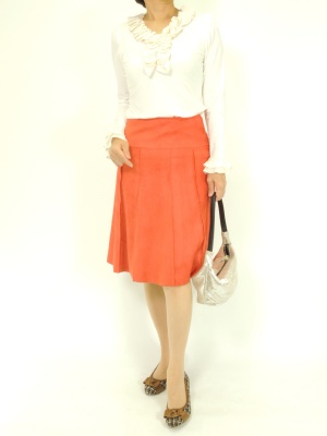 綺麗なオレンジ色のスカートはトップスを控えめにして、色を際立たせたい!フェミニン度70%、エレガンス度30%。
