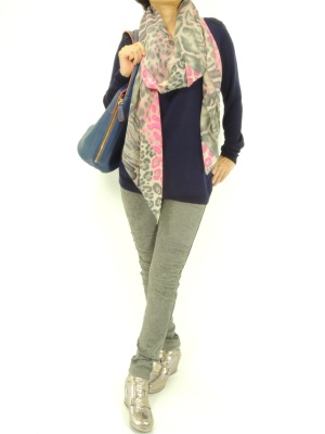 パープル〜グレーのシックなコーディネートには少しのピンクを効かすとお洒落です!アクティブ度90%、フェミニン度10%。