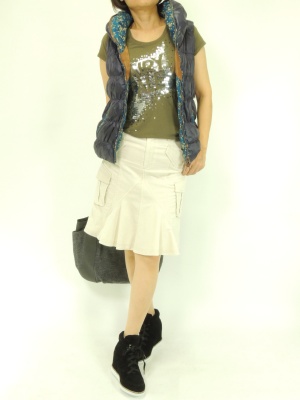 ダウンベストの元気コーデも今年ならスカートを合わせたい。カジュアルなマーメードスカートが新鮮です!アクティブ度80%、フェミニン度20%。
