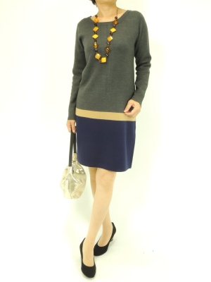 配色ワンピには大ぶりネックレスがお似合い。シンプルコーデでシックな印象に!エレガンス度70%、スタイリッシュ度30%。