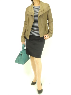 レザージャケットはボーダーカットソーでこなれ感を演出。タイトスカートで女らしく仕上げて!スタイリッシュ度80%、エレガンス度20%。