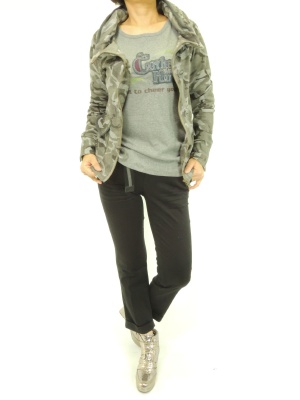 迷彩パーカを思いっきりカジュアルにコーディネート。でも色はグレー〜黒でシックにまとめるのがポイント!アクティブ度100%。
