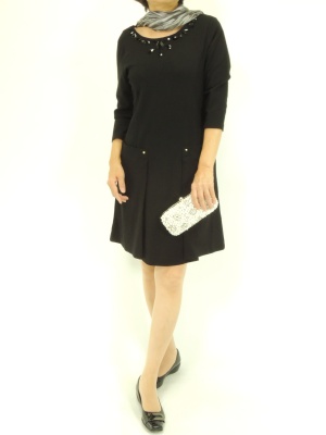 ビジューの付いたブラックワンピはノーアクセで。光沢ストールは後ろに垂らすとバランスが良い!エレガンス度80%、フェミニン度20%。