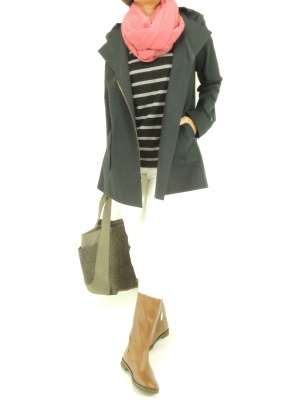 これからの時期に重宝するコットンのコート。ネイビーならピンクの差し色も良く映えます!アクティブ度90%、フェミニン度10%。
